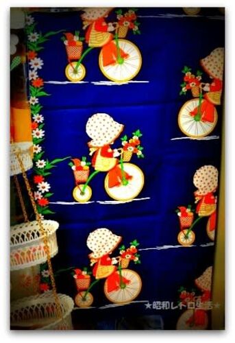 ネットショップで購入したレトロ生地です。 サンボンネット・スー?に、自転車のカゴには野菜とお花私の大好きなタイプの絵柄です♪ ほんとはカーテンを作りたかったのですが、1mしかないので「のれん」を縫ってみました (「のれん」というよりカフェカー…